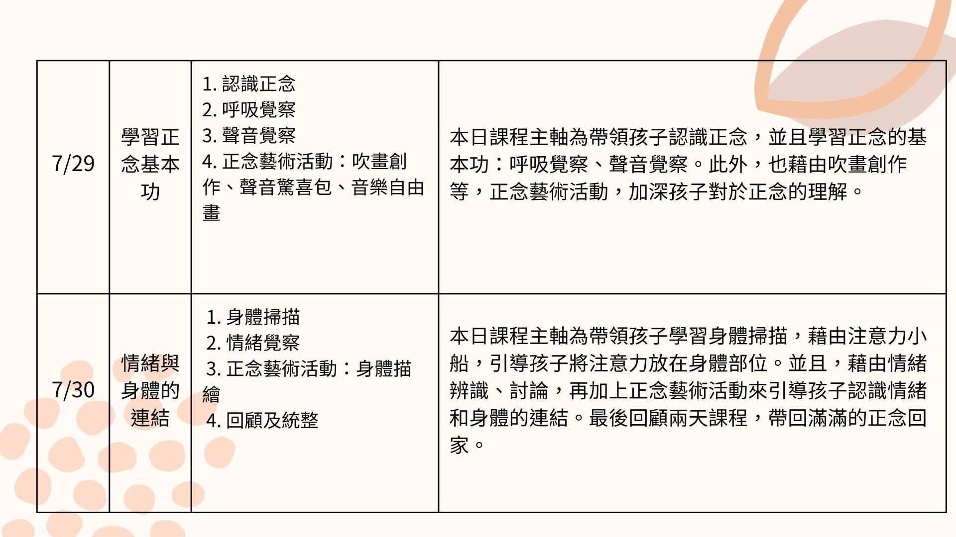 Hello!超級開心地告訴大家,由職能治療師和藝術治療師共同設計的兒童正念藝術營隊來啦!這次的課程是由姚丹雅職能治療師和呂冠廷藝術治療師聯手打造,超級實用又超級有趣!課程內容包括學習正念基本功,像是呼吸覺察、身體掃描等,還有超好玩的正念藝術活動,像是吹畫創作等等。透過這些活動,我們可以引導孩子們學習專注、穩定情緒。由於學習正念需要循序漸進,所以我們採取兩個半天的課程模式,這樣孩子們就可以輕鬆學習,不用擔心孩子們一口氣吸收太多,反而影響學習成效!讓我們一起在這個暑假,送給孩子一份超棒的禮物吧!讓他們學會正念,可以更輕鬆地適應開學後的生活!