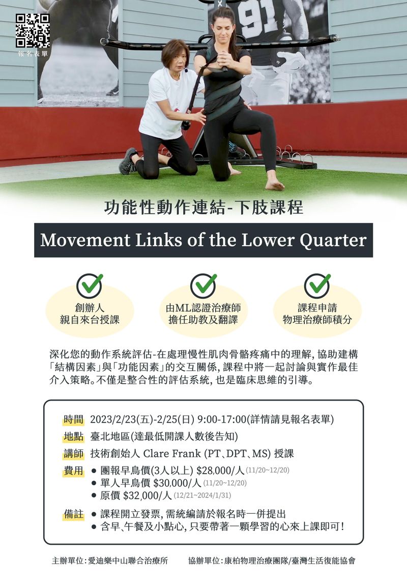 此次課程非常特別的是,創辦人Clare Frank親自來台授課,並且睽違多年親自實體講授Lower quarter課程;此外為協助學員學習,將有經Movement Links認證的治療師擔任助教及翻譯,全台僅有六名治療師經ML認證, 在愛迪樂就有兩名,堪稱最強助教陣容!!